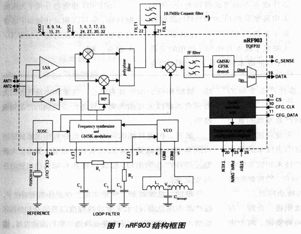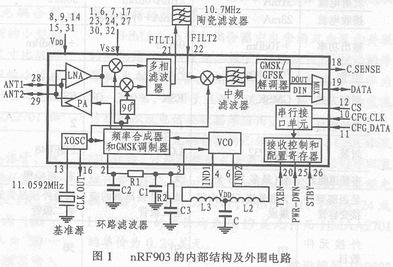 图1是nRF903无线收发芯片的内部原理结构框图及其外围电路。从芯片的内部框图可以看出,NRF903内部由低噪声放大器LNA、功率放大器PA、压控振荡器VCO、GMSK调制解调、频率基准源、PLL频率合成、数字静噪电路以及单片机接口等组成。