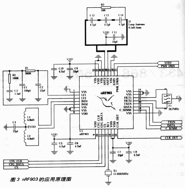 nRF903的天线接口设计为差分天线,以便于使用低成本的PCB天线,所有的参数包括工作频率和发射功率都可以通过一个14位的配置寄存器用串行线(CS、CFG_CLK和CFG_DATA)进行设置。图3所示为使用环形天线的nRF903的应用电路图。