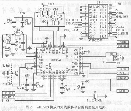 图3是nRF903的典型应用原理图。图中可以看到,外围元件很少,包括一个基准晶体及几个无源器件,没有调试部件,这给研制及生产带来了极大的方便。